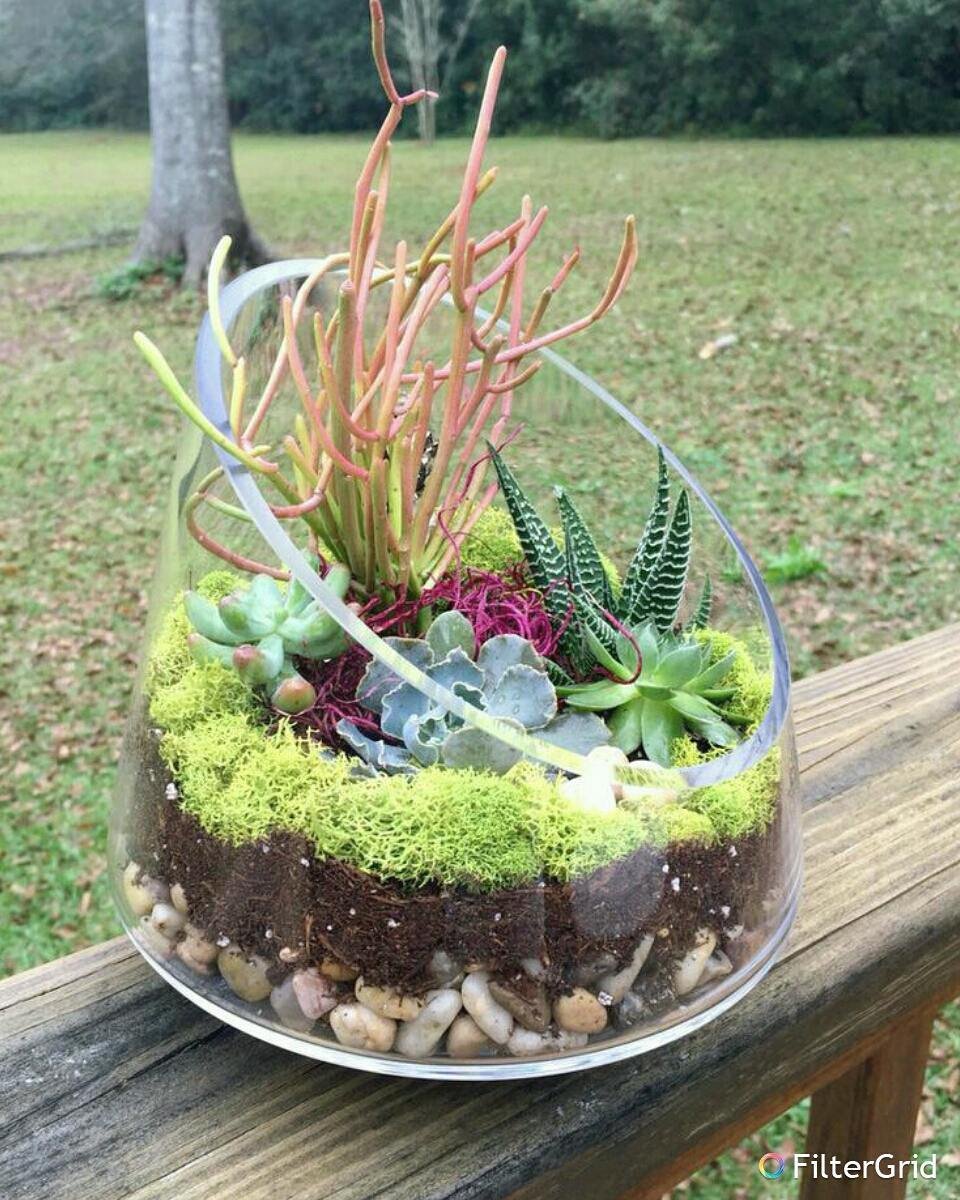 Eredeti és egyedi ötlet, ha valamilyen szokatlan, aszimmetrikus alakú üvegkaspóba tesszük a kaktuszokat. Adhatunk hozzá másféle növényeket is, hogy igazi kis zöld szigetet kapjunk. A kaspó aljára mindenképp tegyünk köveket, amik elvezetik a felesleges vizet. Ugye milyen jól néz ki, ahogy látni lehet a különböző rétegeket?