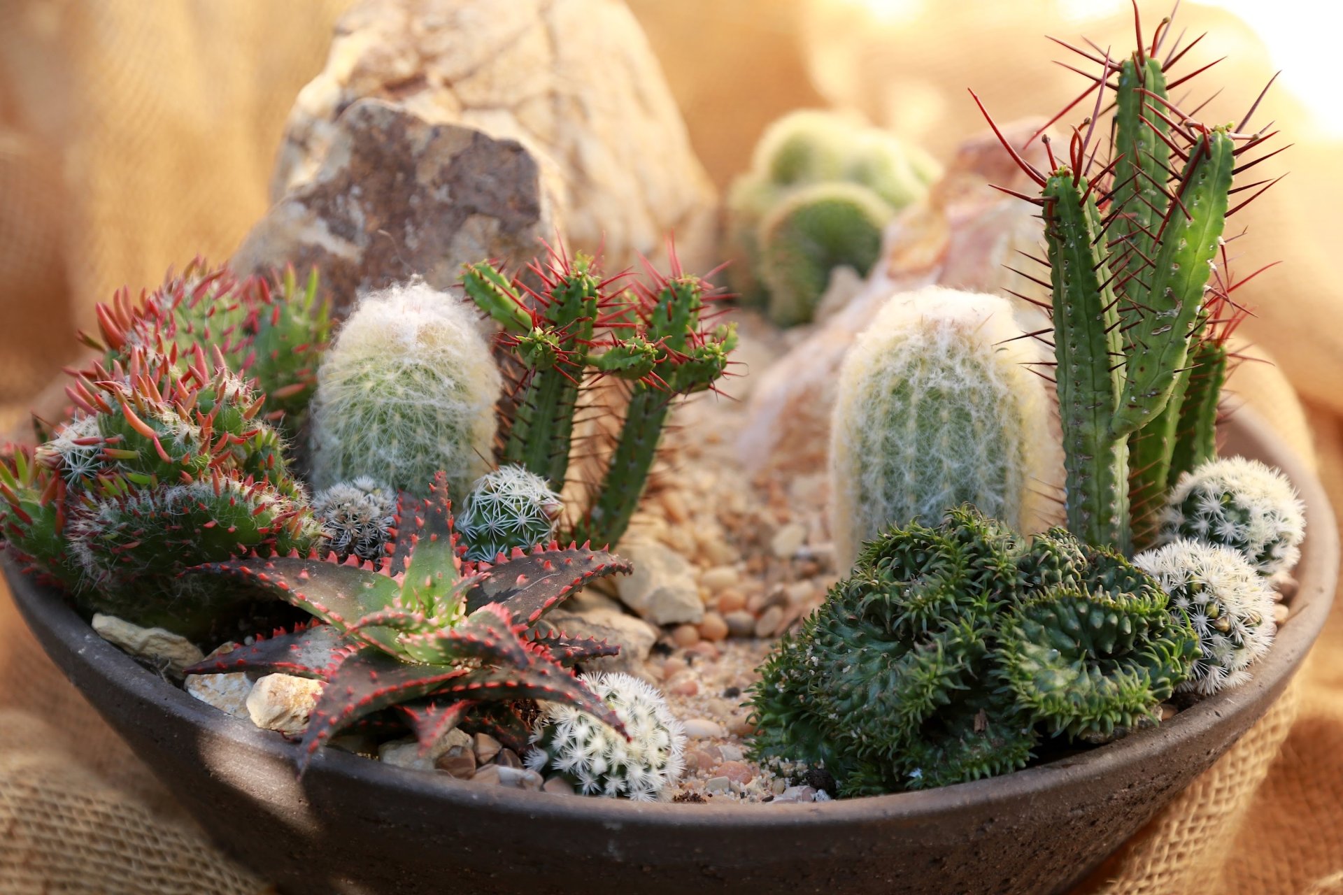 Sokféle elrendezés közül választhatunk, de mind közül a legegyszerűbb, ha egy tálba tesszük a kis kaktuszokat, pár kővel díszítjük, és máris egy sivatagi látképet kapunk: a mi kis saját sivatagunkat. Nagyon mutatós darab, ami biztosan fel fog tűnni a vendégeknek is.