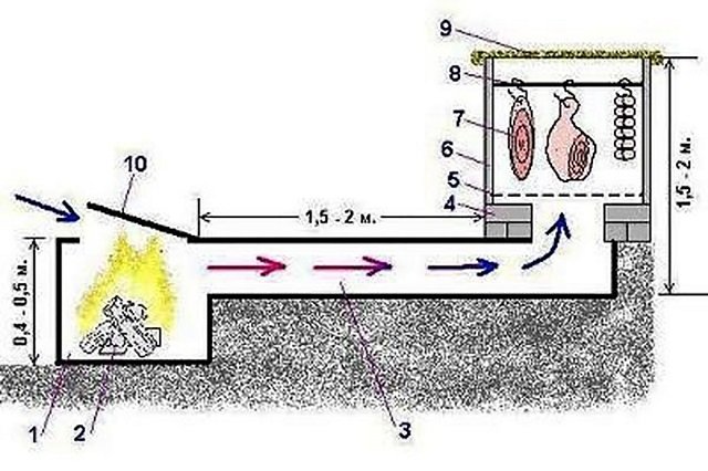 A füstölő elkészítése egyáltalán nem bonyolult, a fent látható tervrajz rengeteget segíthet mindenkinek, íme hozzá egy kis jelmagyarázat: tűztér (1), fa (2), kémény (3), téglafal (4), fémrács (5), fából, vagy fémből készült kamra (6), felakasztott húsok, sonkák, kolbászok, stb. (7), tartórudak (8), háló (9), kisajtó (10).