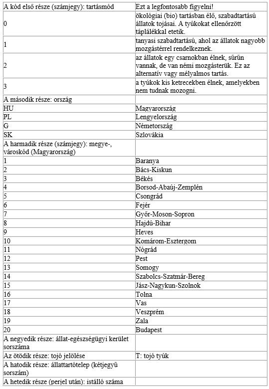 A tojásokon fel kell legyen tüntetve a termelői kód, és a nyilvántartási szám (ez hét részből áll, többek között megmutatja a telepet, és a tartási módot. Ha piacon vásárolunk tojást, akkor találkozhatunk jelölésnélkülivel is, ugyanis a jelölési kötelezettségek nem vonatkoznak azokra a tojótyúkot tartó termelőkre, akik elmúltak 50 évesek, ugyanakkor az értékesítés helyén ezen termelőknek is fel kell tüntetniük a nevet, valamint a címet. Ezek voltak tehát a legfontosabbak, most pedig nézzük a teljes táblázatot!