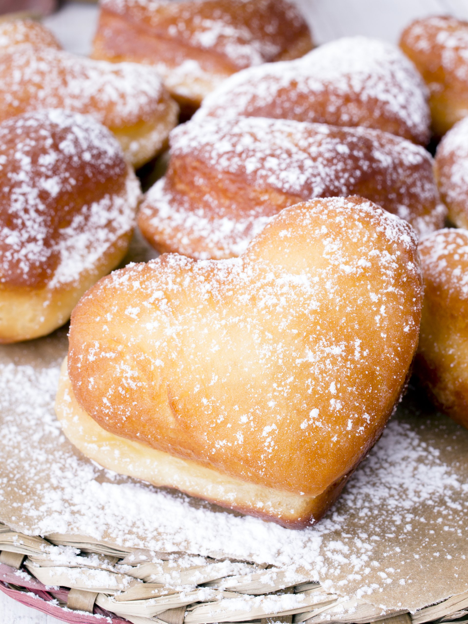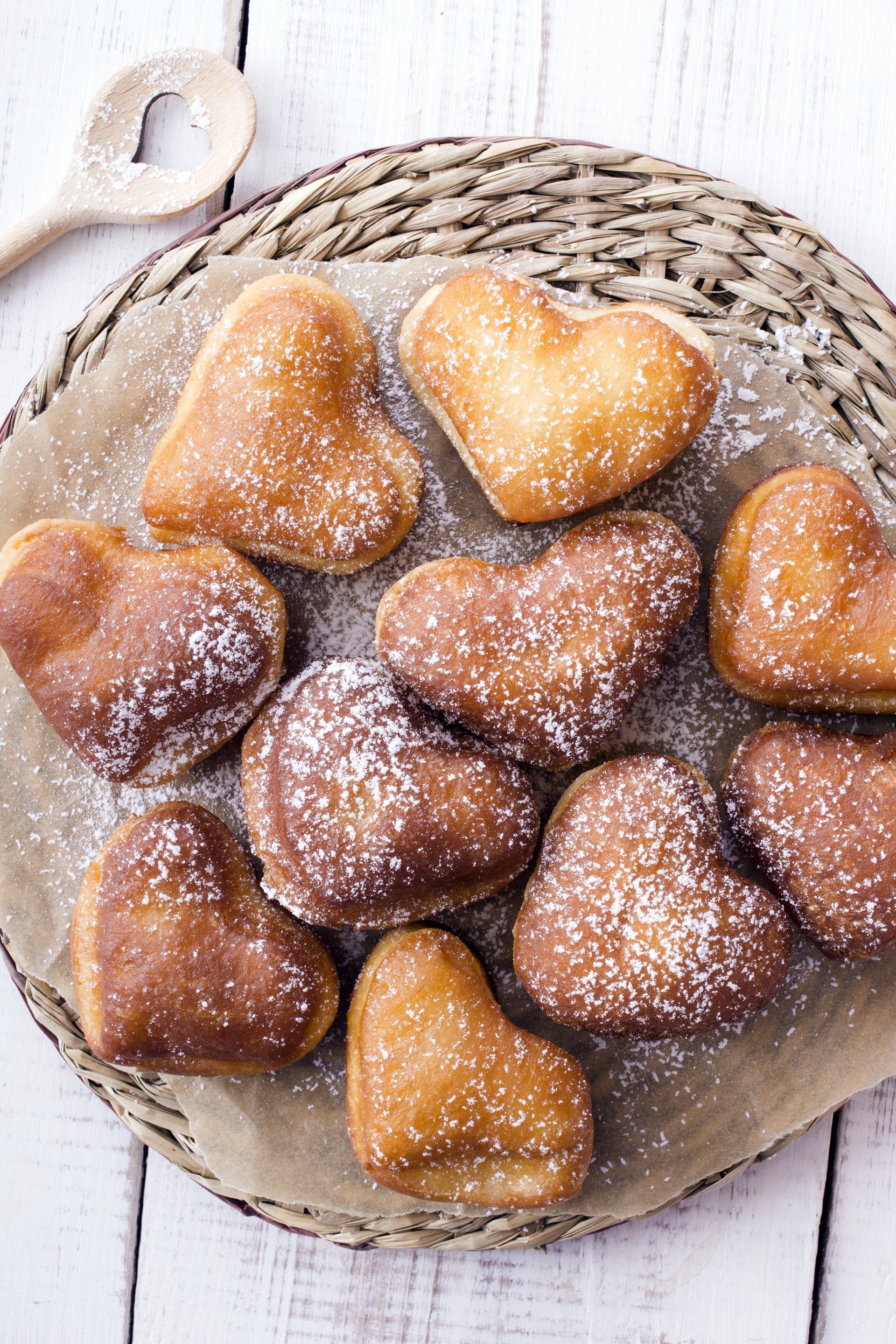 Amikor a tészta kész, szórjunk meg elegendő liszttel egy tiszta, sima felületet a pulton. A tésztába beleboxolunk egyet és kiborítjuk a felületre. Szórd meg liszttel a sodrófát és a tésztát, ügyelve arra, hogy a sarkok és a tészta minden része ne legyen ragacsos. Kezeddeé (lehet, hogy lisztet is dörzsölhet rájuk) nyújtsd ki a tésztát. Szív alakú pogácsaszaggatóval vágjunk ki annyi fánkot, amennyit csak tudunk. Szép élesek legyen a vágott vonalak, hogy majd sütés után is megmaradjon a szív alakja. A fánkokat sütőpapírral bélelt tepsire vagy nagy tálcára helyezzük. Fedjük le őket, és hagyjuk újra kelni kb. 1 óráig.